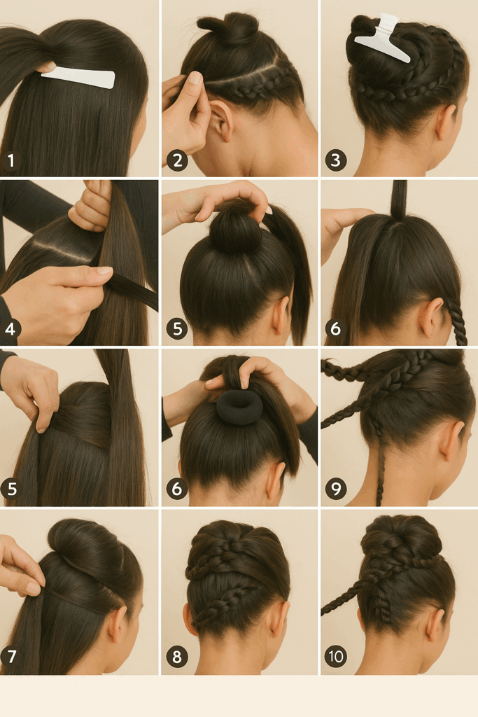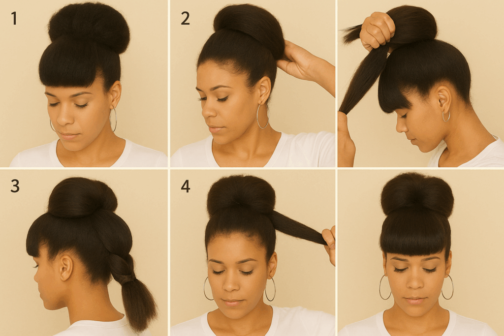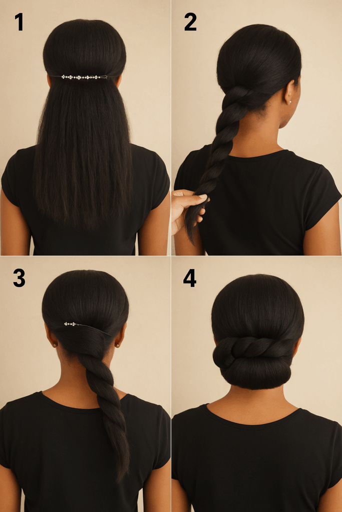 Astuce bonus : Ajoutez une mèche tressée enroulée autour du chignon pour plus d’élégance.